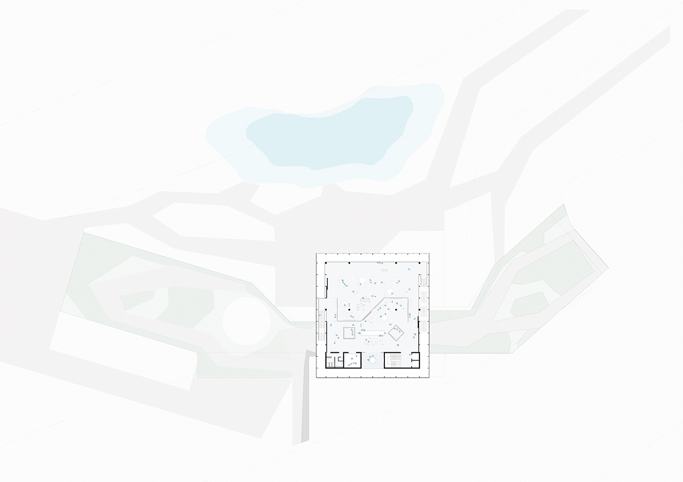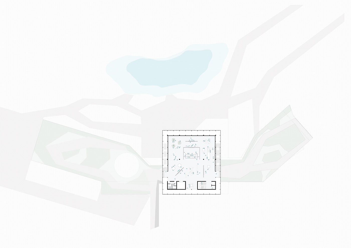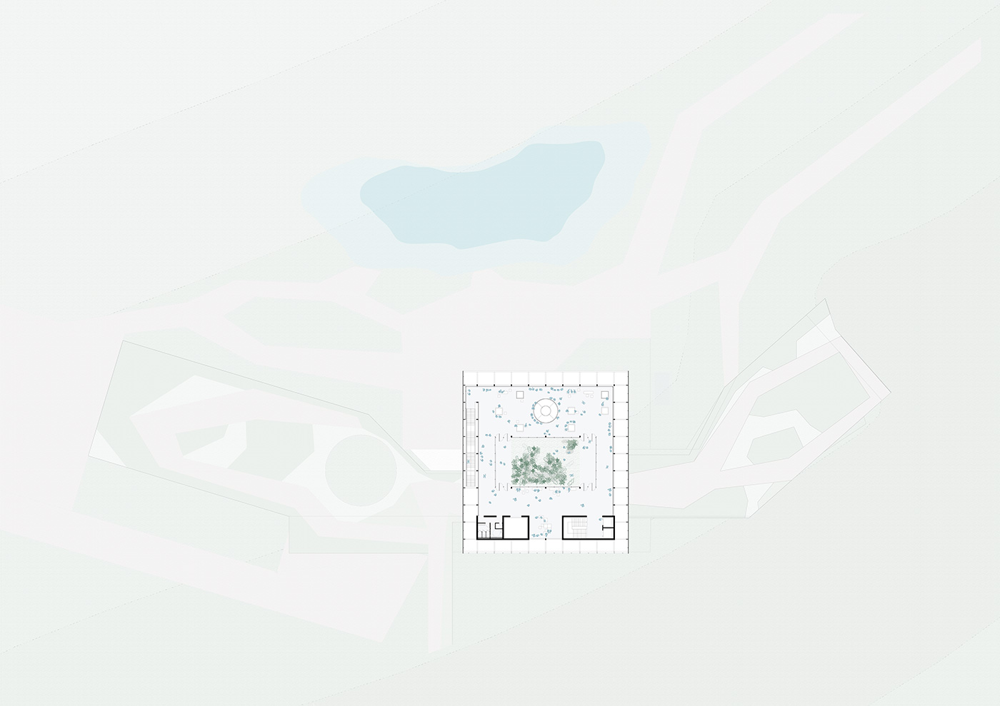 Estas raízes se desenham como uma acolhedora marquise assentada cuidadosamente na topografia, que organiza os programas de acesso mais livre e independentes dos espaços expositivos. Estas raízes desenham também um jardim de terraços, que deverá se tornar um parque de interesse regional em conjunto com o Centro de Visitantes.