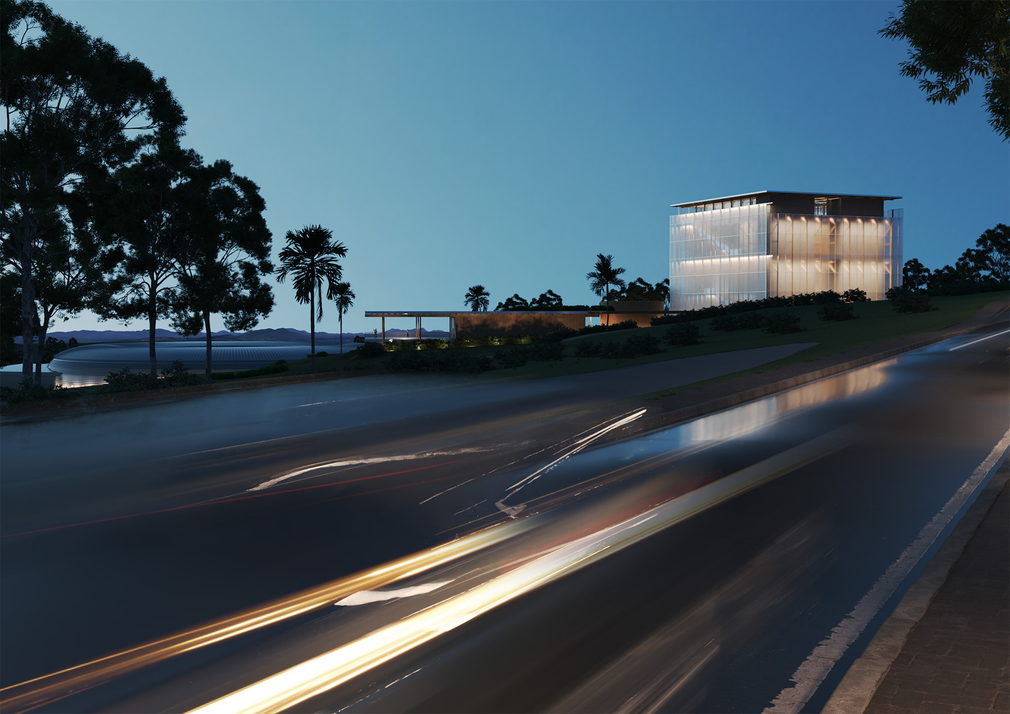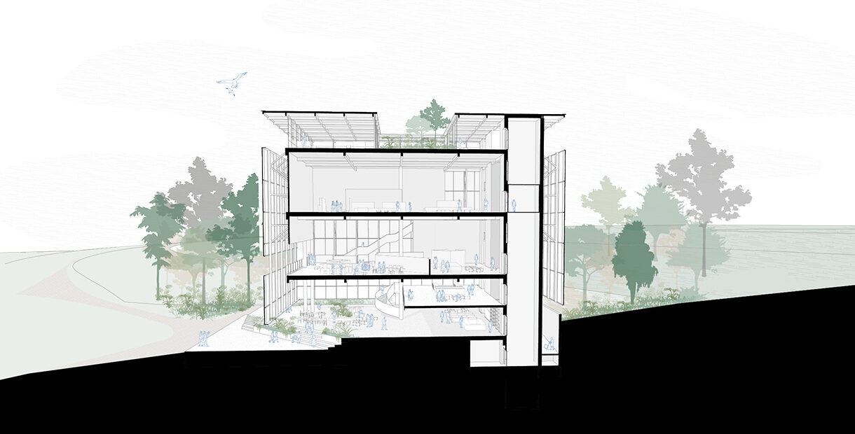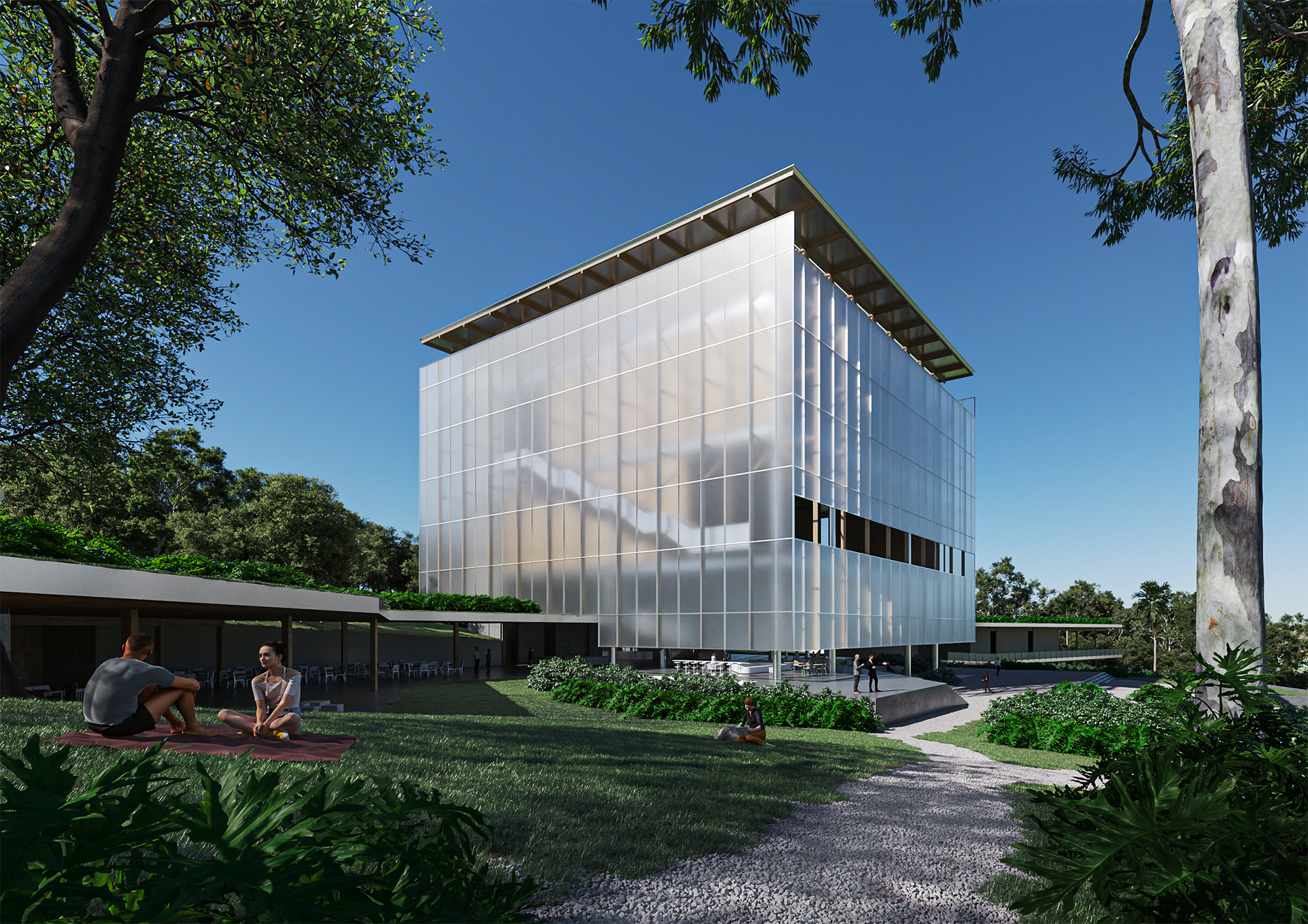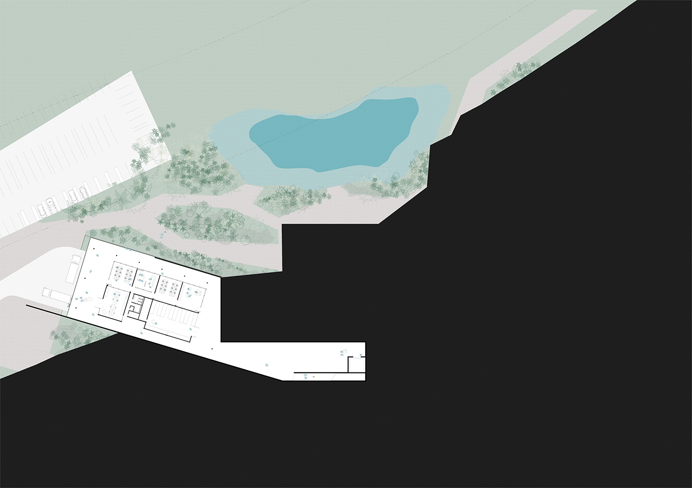 Estas raízes se desenham como uma acolhedora marquise assentada cuidadosamente na topografia, que organiza os programas de acesso mais livre e independentes dos espaços expositivos. Estas raízes desenham também um jardim de terraços, que deverá se tornar um parque de interesse regional em conjunto com o Centro de Visitantes.