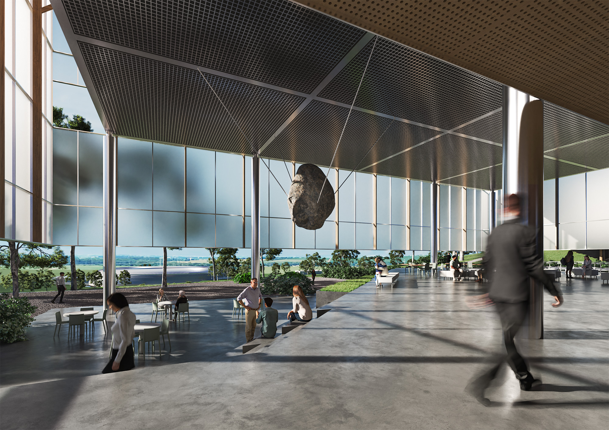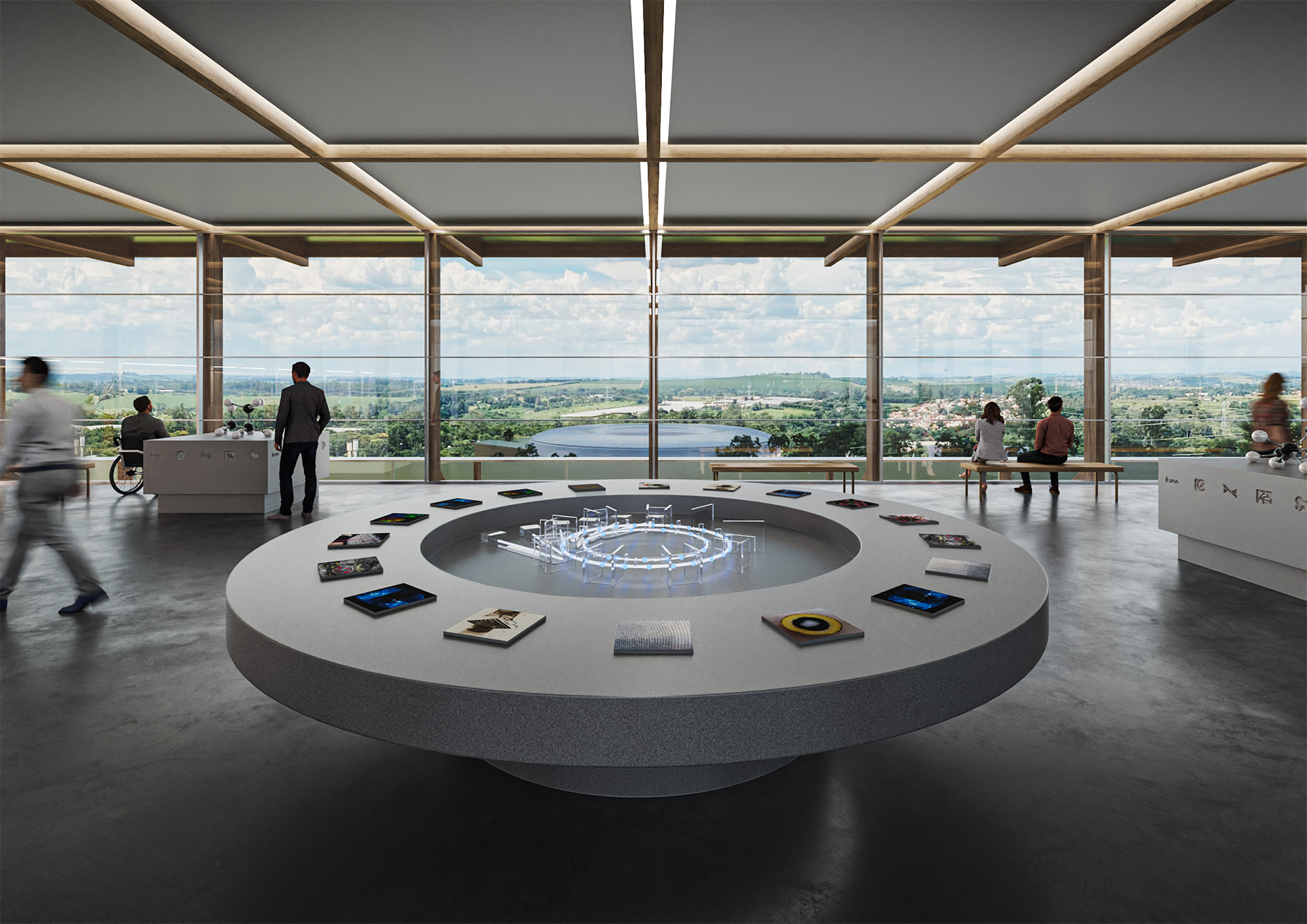 Durante o dia, a torre permite a entrada de luz natural nas áreas de circulação, reforçando uma ligação entre o interior do edifício e o ambiente externo, oferecendo vistas panorâmicas para o campus CNPEM. Os visitantes estarão envolvidos em diferentes temas científicos e tecnológicos dentro das áreas herméticas das exposições e ao circularem entre pavimentos, poderão avistar na paisagem os laboratórios do campus onde as pesquisas sobre esses temas são realizadas.