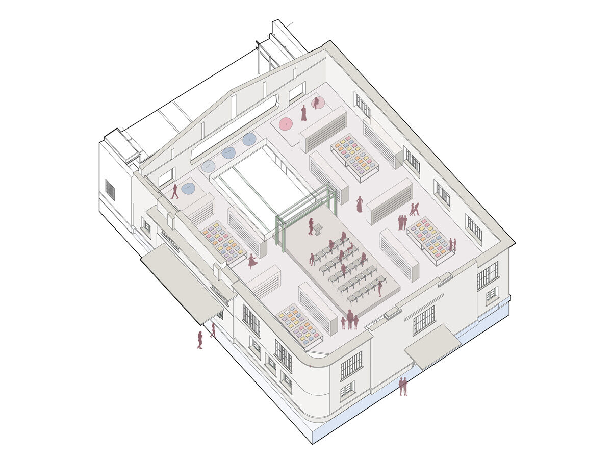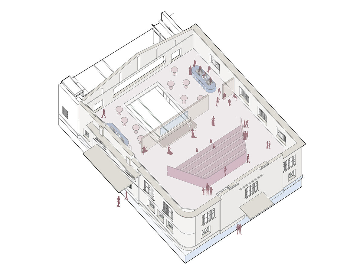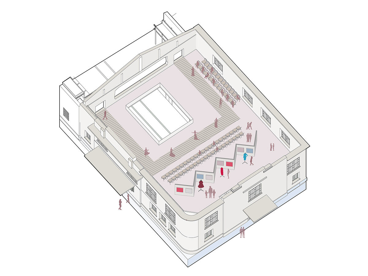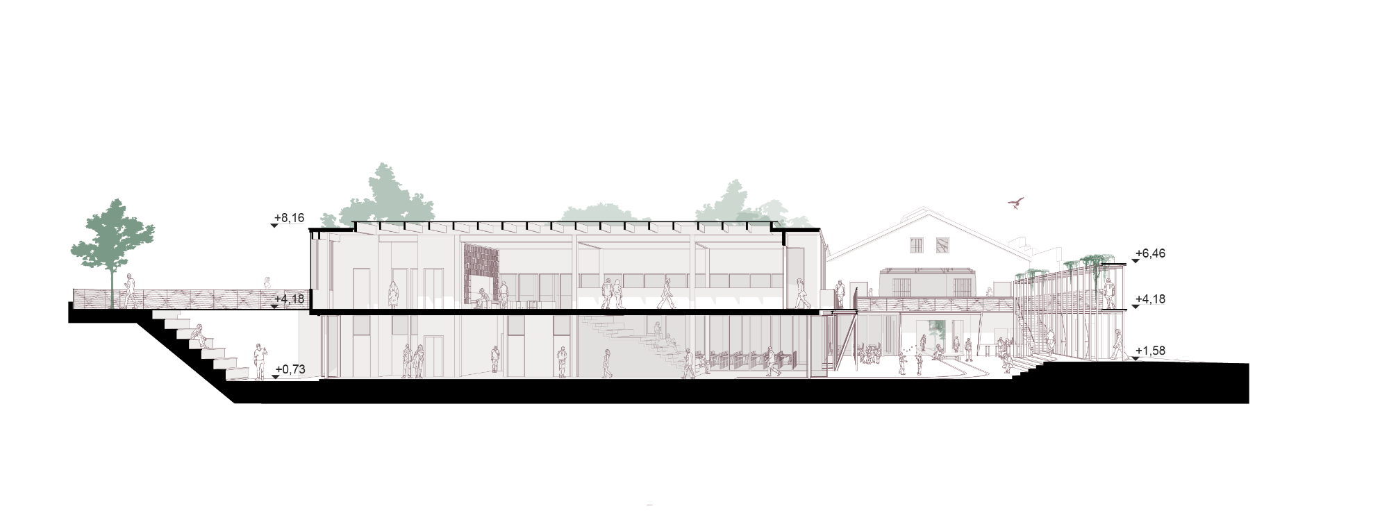 O volume proposto, que abrigará a Escola Municipal de Artes, é posicionado de forma que seu átrio se abra para a nova praça, em diálogo com o hall do edifício tombado. Essa solução interliga os vazios e organiza os fluxos de circulação. Hall, praça, átrio e arquibancada se articulam em escalas distintas e níveis variados de privacidade, combinando espaços abertos e cobertos, flexíveis o suficiente para abrigar usos sociais, econômicos e culturais diversos.