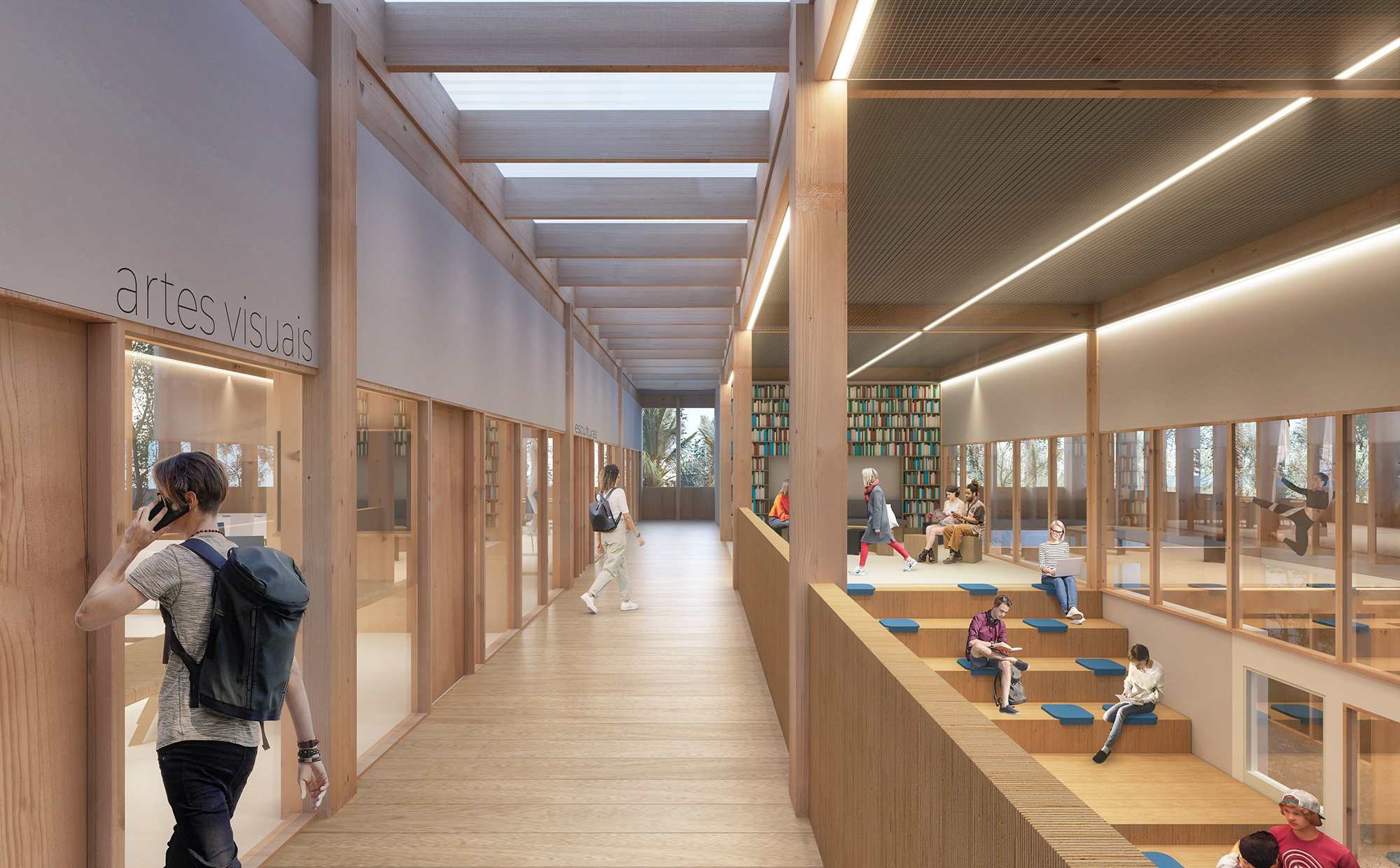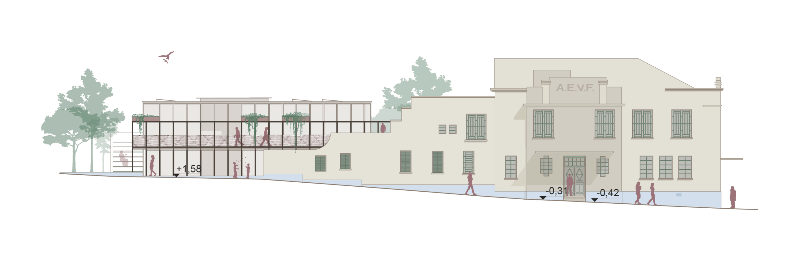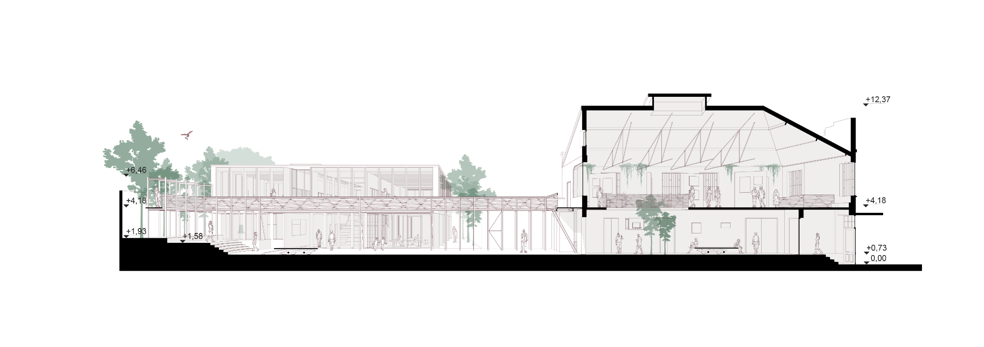 O volume proposto, que abrigará a Escola Municipal de Artes, é posicionado de forma que seu átrio se abra para a nova praça, em diálogo com o hall do edifício tombado. Essa solução interliga os vazios e organiza os fluxos de circulação. Hall, praça, átrio e arquibancada se articulam em escalas distintas e níveis variados de privacidade, combinando espaços abertos e cobertos, flexíveis o suficiente para abrigar usos sociais, econômicos e culturais diversos.