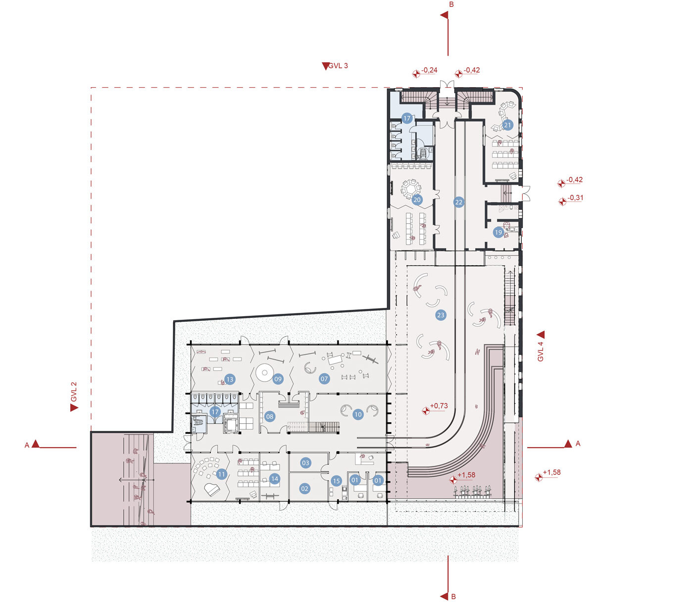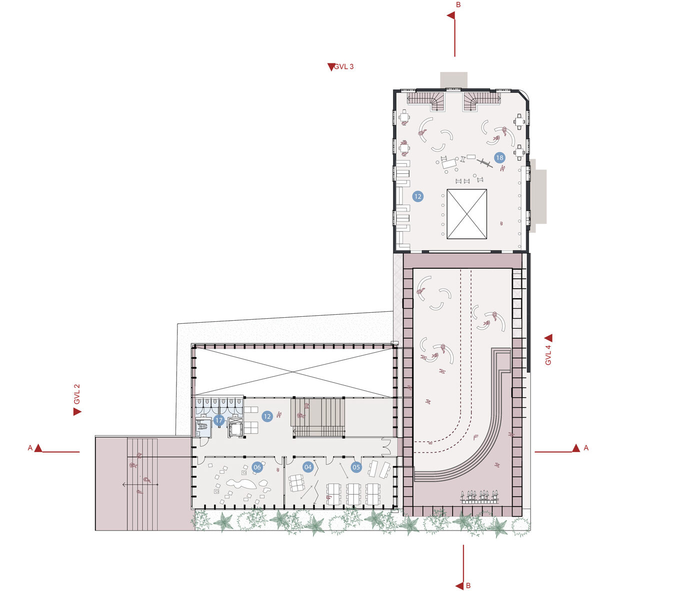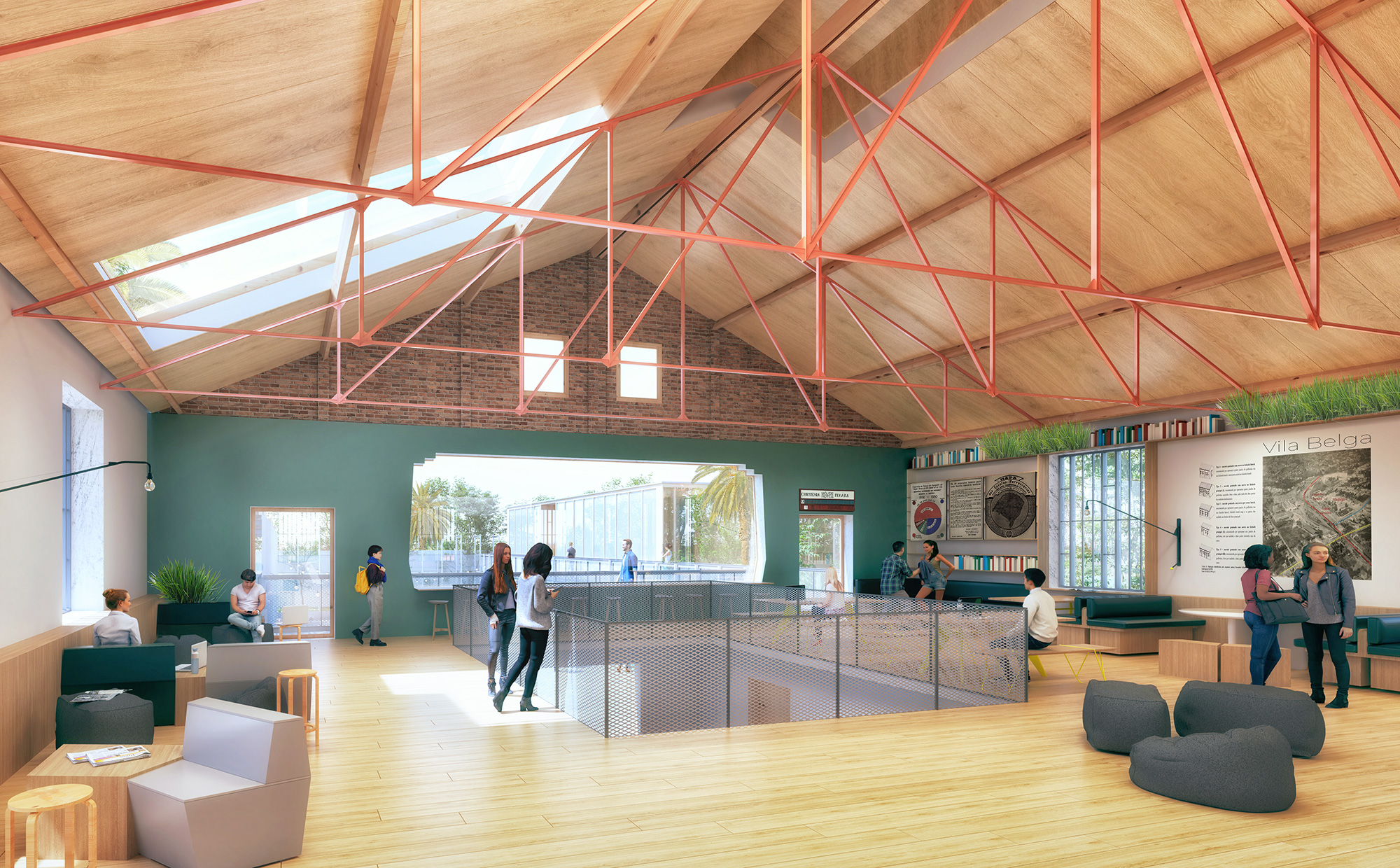 Para estimular a inovação e a economia criativa na Vila Belga, é essencial criar, antes de tudo, um espaço de encontros e trocas. Com esse objetivo, optou-se por valorizar o conjunto arquitetônico Art Déco da antiga sede do Clube dos Ferroviários por meio da supressão dos edifícios não tombados, abrindo espaço para uma generosa praça semi-pública — o coração do projeto. Essa praça impulsiona o engajamento social (inclusive intergeracional) e empreendedor, conectando o Centro à cidade e respondendo diretamente à demanda regional por áreas de convivência e lazer.