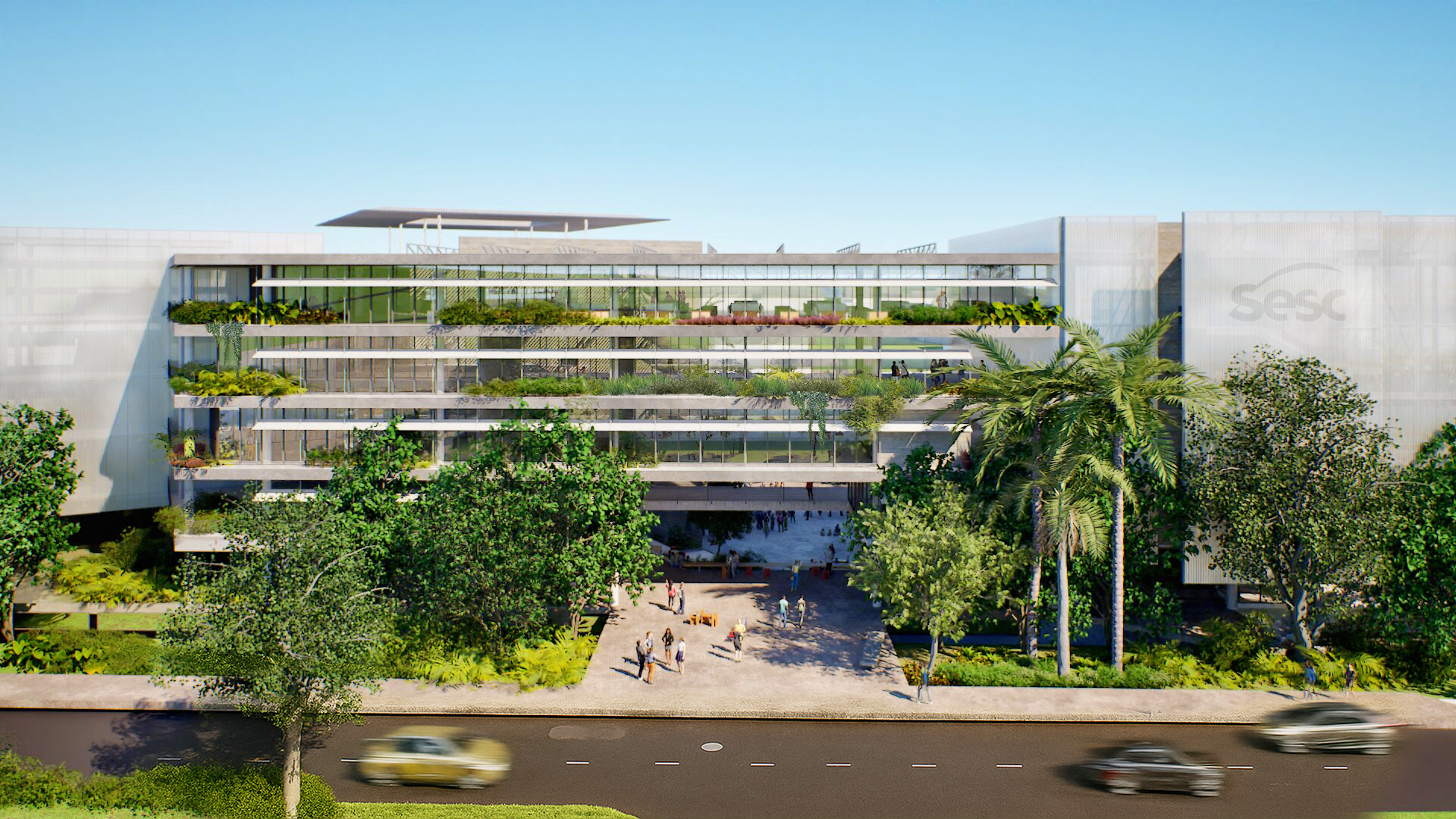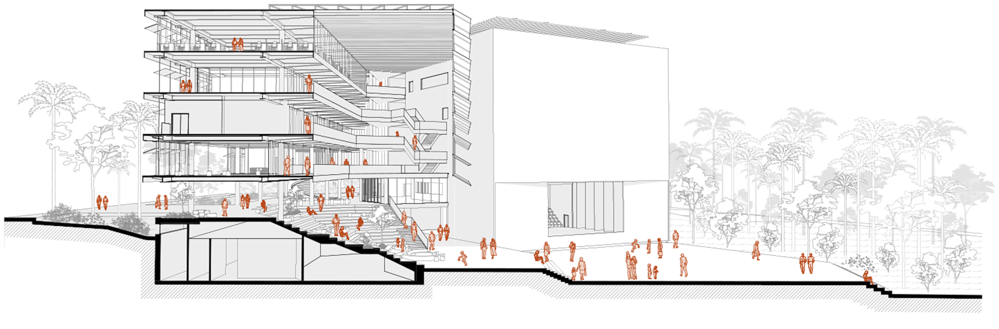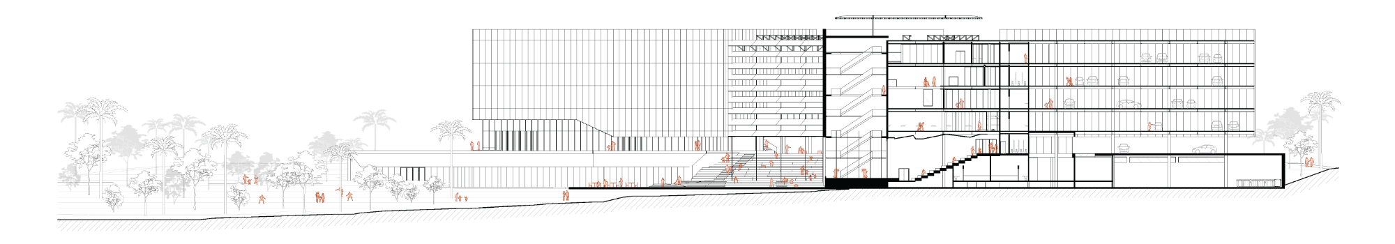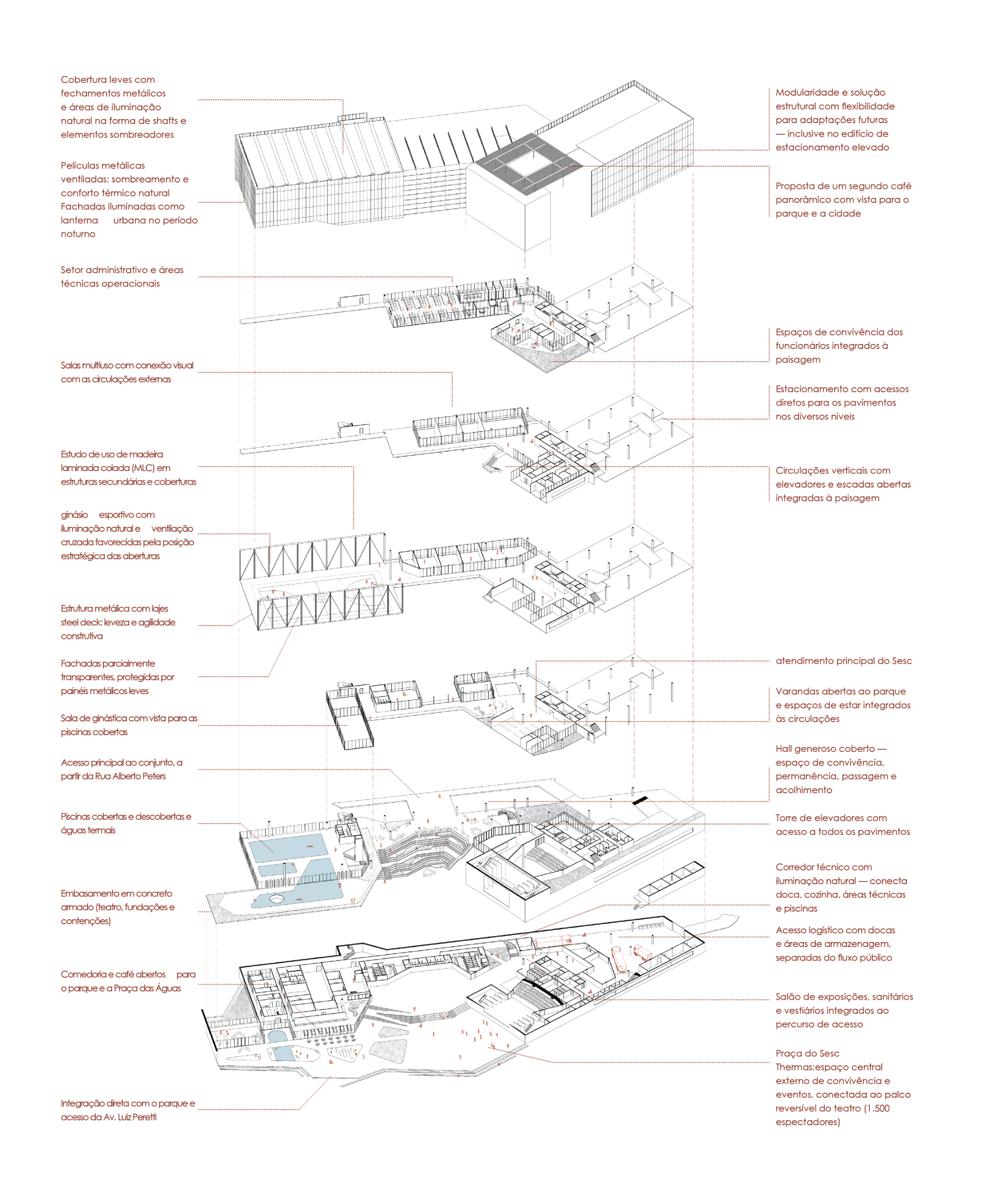 Um circuito contínuo de pedestres atravessa os níveis do terreno, conectando os acessos da Rua Alberto Peters e da Avenida Luiz Peretti. Essa promenade transforma o edifício em uma topografia construída, que organiza os fluxos e estrutura o programa: áreas técnicas, espaços de convivência, comedoria, centro ambiental, teatro, esportes, setor infantil e administração.