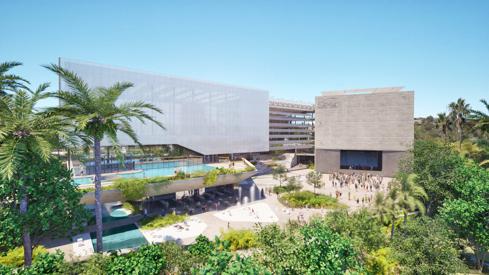A arquitetura não se impõe à paisagem: dialoga com ela. O edifício configura um marco simbólico, sem perder a escala adequada ao bairro e ao parque. Seu gabarito é contido, a linguagem leve e permeável. Os acessos são convidativos, as fachadas se abrem ao verde, e os limites entre construção e natureza se dissolvem como o vapor das águas quentes que definem o Sesc Thermas.