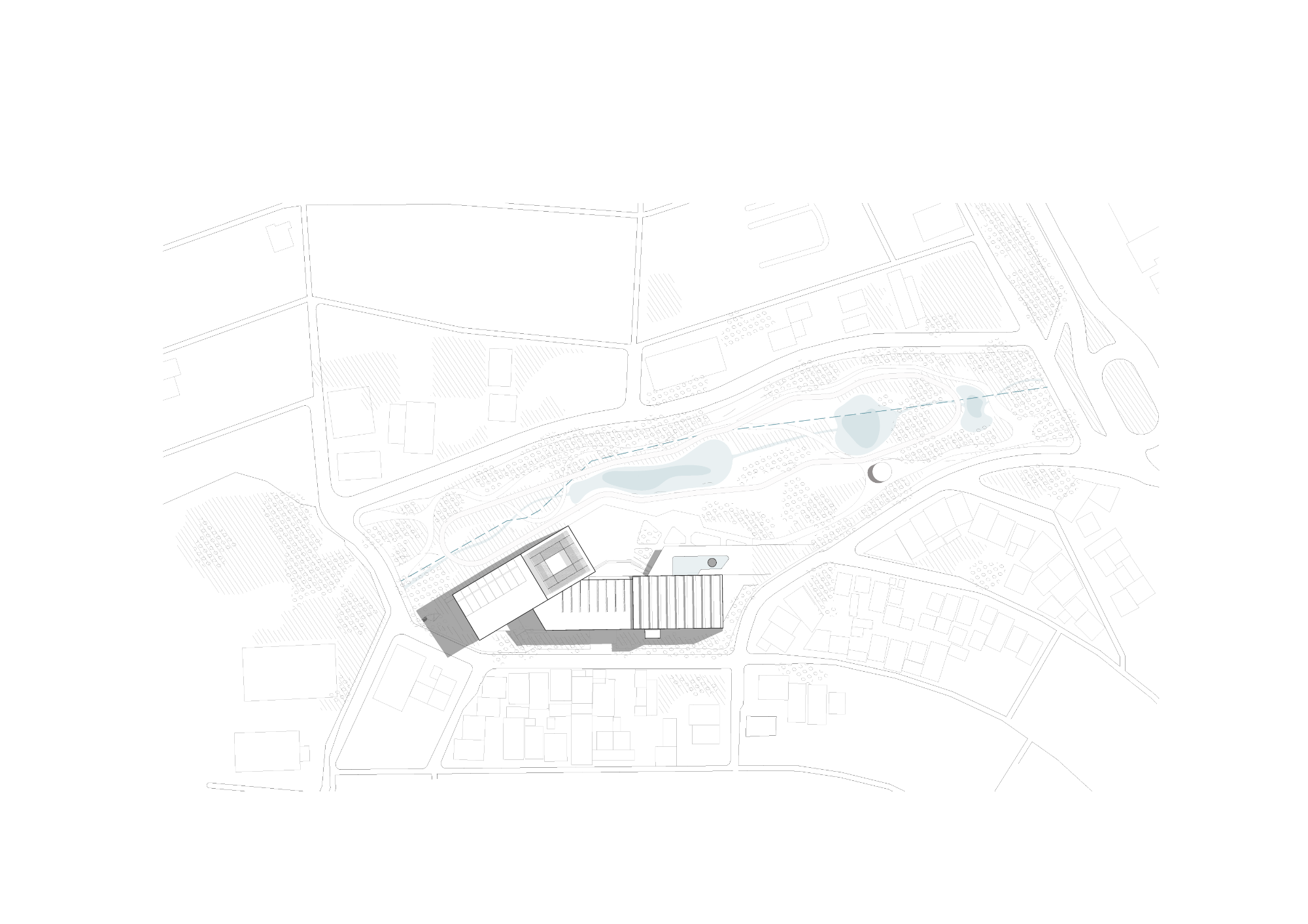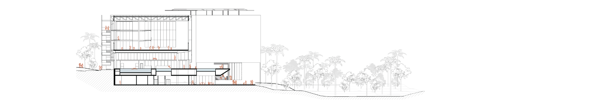 A edificação se concentra sobre a clareira já ocupada por construções a serem removidas. Assim, evita-se a supressão de vegetação, respeitando os recuos do curso d’água e a cota de inundação. Essa implantação consciente preserva o parque e potencializa seu uso público. O edifício organiza-se em patamares que acompanham os níveis naturais do terreno, reduzindo escavações e fundações complexas. A verticalização, nesse caso, se equilibra com a intenção de manter o contato direto com o solo e o ambiente natural.