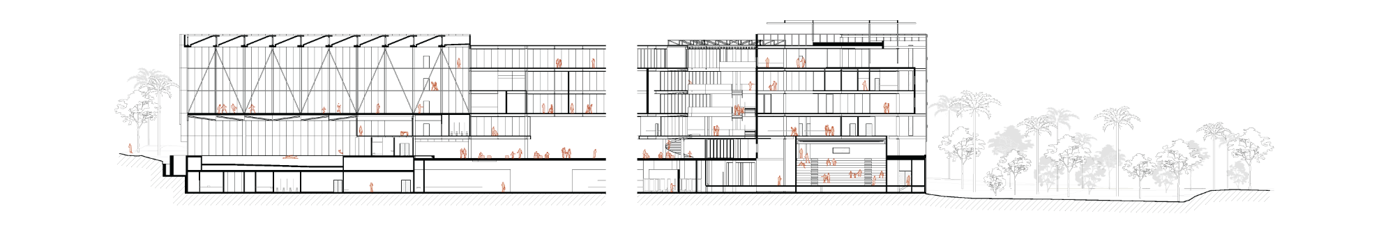 Do lado norte, uma elevação abriga o complexo esportivo: piscinas, salas de ginástica e ginásio. Ao sul, outra montanha abriga o teatro, os serviços administrativos e o estacionamento. Entre essas duas massas, o edifício se rasga em varandas e escadas abertas que costuram os pavimentos com leveza e transparência. Esses elementos revelam o parque ao caminhar e oferecem pontos de estar, convivência e contemplação.