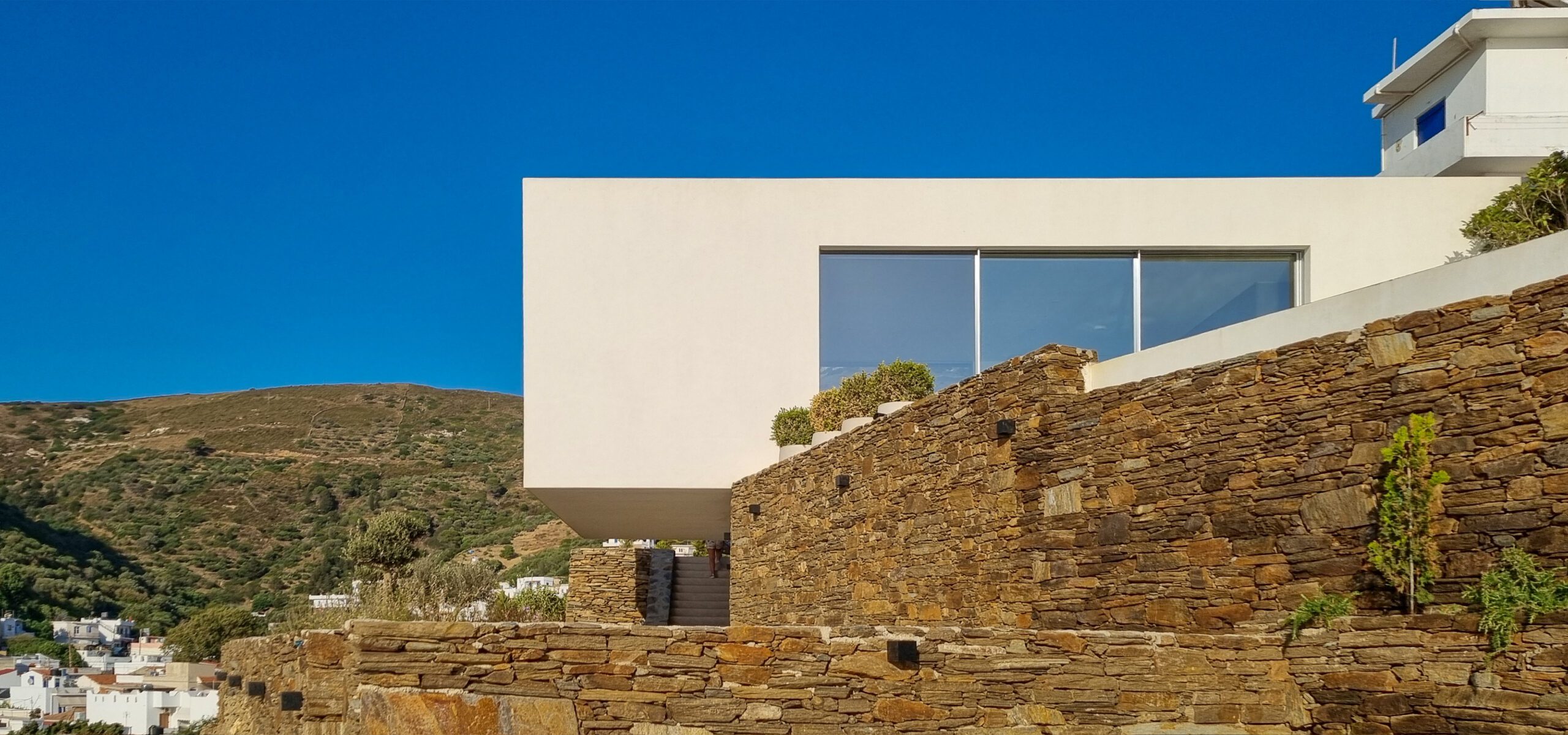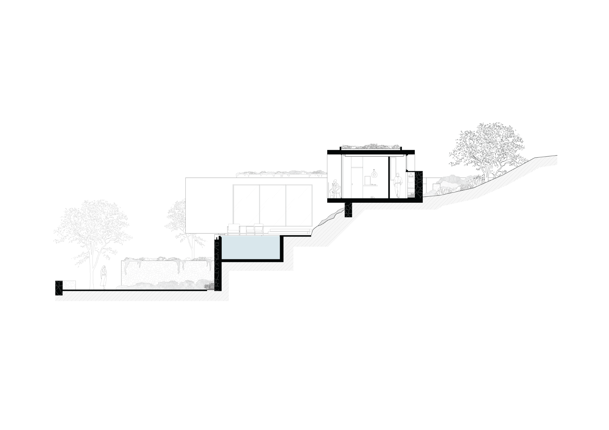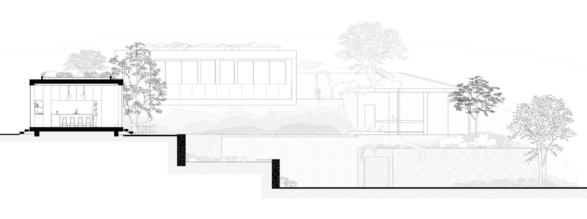Utilizando os muros de pedra existentes como diretrizes, a casa é disposta em dois volumes retangulares de 6m de largura: um no nível do platô (+19,0m) com orientação norte-sul e o outro na cota +21,0m em orientação nordeste-sudoeste. Essa composição cria uma forma em “L” obtuso que define o jardim interno, com piscina e áreas de estar, além de emoldurar as vistas da paisagem circundante.