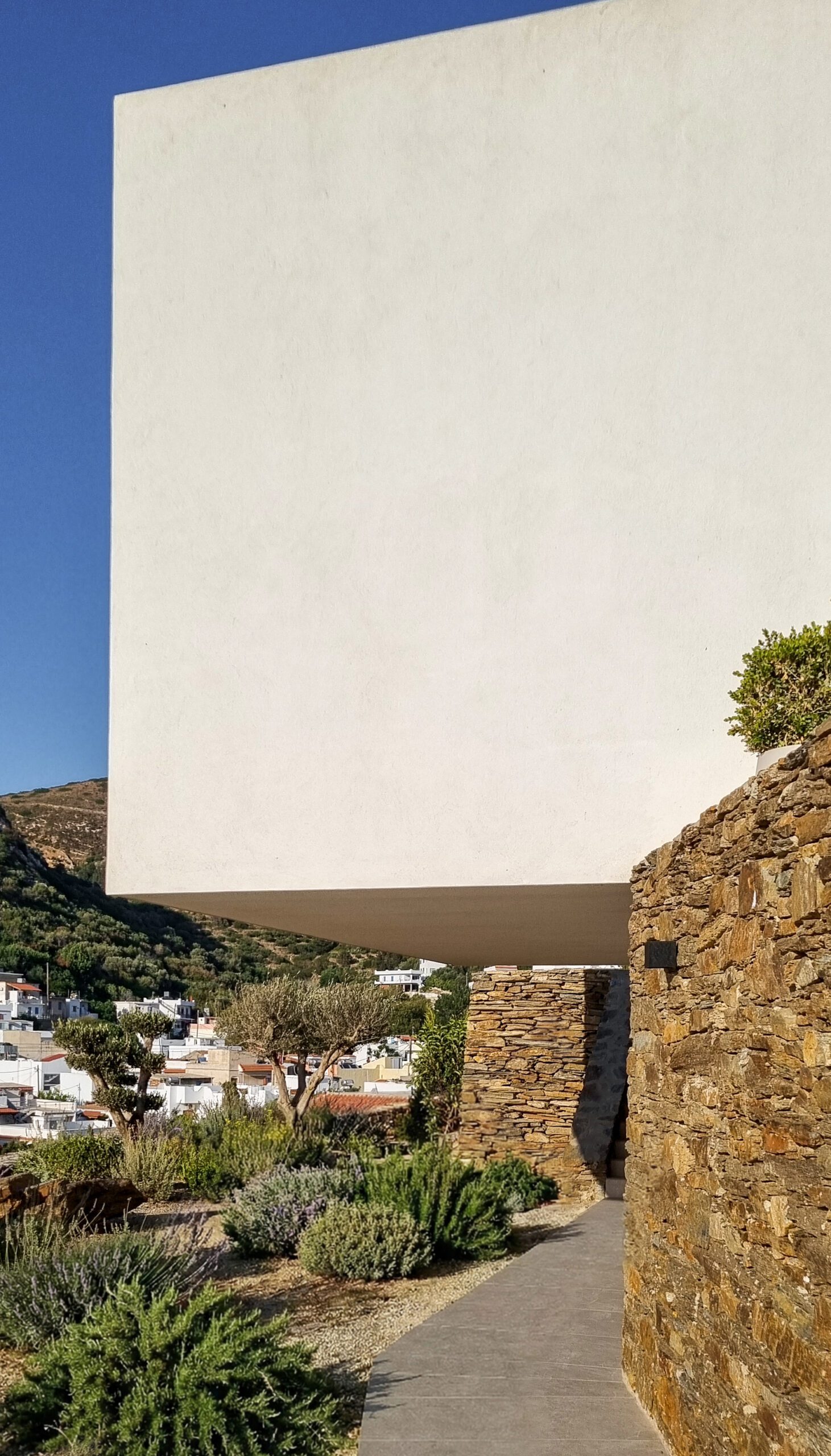 Devido aos fortes ventos do norte que trazem o sal do mar e o forte calor durante o verão, a resiliência é primordial para esta construção. Foram escolhidos materiais locais e brutos. A estrutura principal em concreto garante longevidade e resistência contra terremotos. Telhados verdes com plantas locais funcionam como isolamento térmico passivo, e painéis solares aproveitam a alta incidência solar. A cor branca simples pinta as fachadas para fundir a casa mais delicadamente ao entorno e também para ajudar a refletir o calor.
