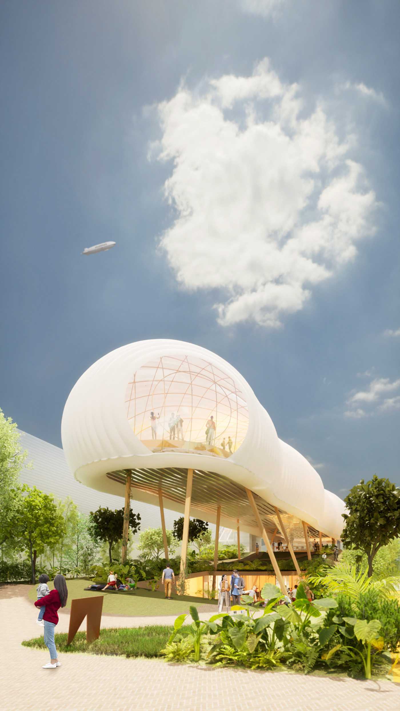 Propomos uma paisagem caminhável onde o público chega informalmente a um balão-nuvem suspenso. A nuvem é hoje um ícone da tecnologia e também um sinal de mudança climática. Também a nuvem é uma citação da obra Manto Tupinambá, da Lygia Pape, uma nuvem vermelha sobre a Baía da Guanabara – um comentário sobre uma tradição indígena de proteção da terra. O balão tem sido, tradicionalmente, um sinal de futuro – e também um comentário sobre o pioneirismo do Brasil em tecnologias de voo. Nosso projeto é uma montagem de um sonho onde o conhecimento ancestral dos povos florestais e nossos medos futuristas urbanos podem se encontrar em um acontecimento ambiental lúdico e acolhedor